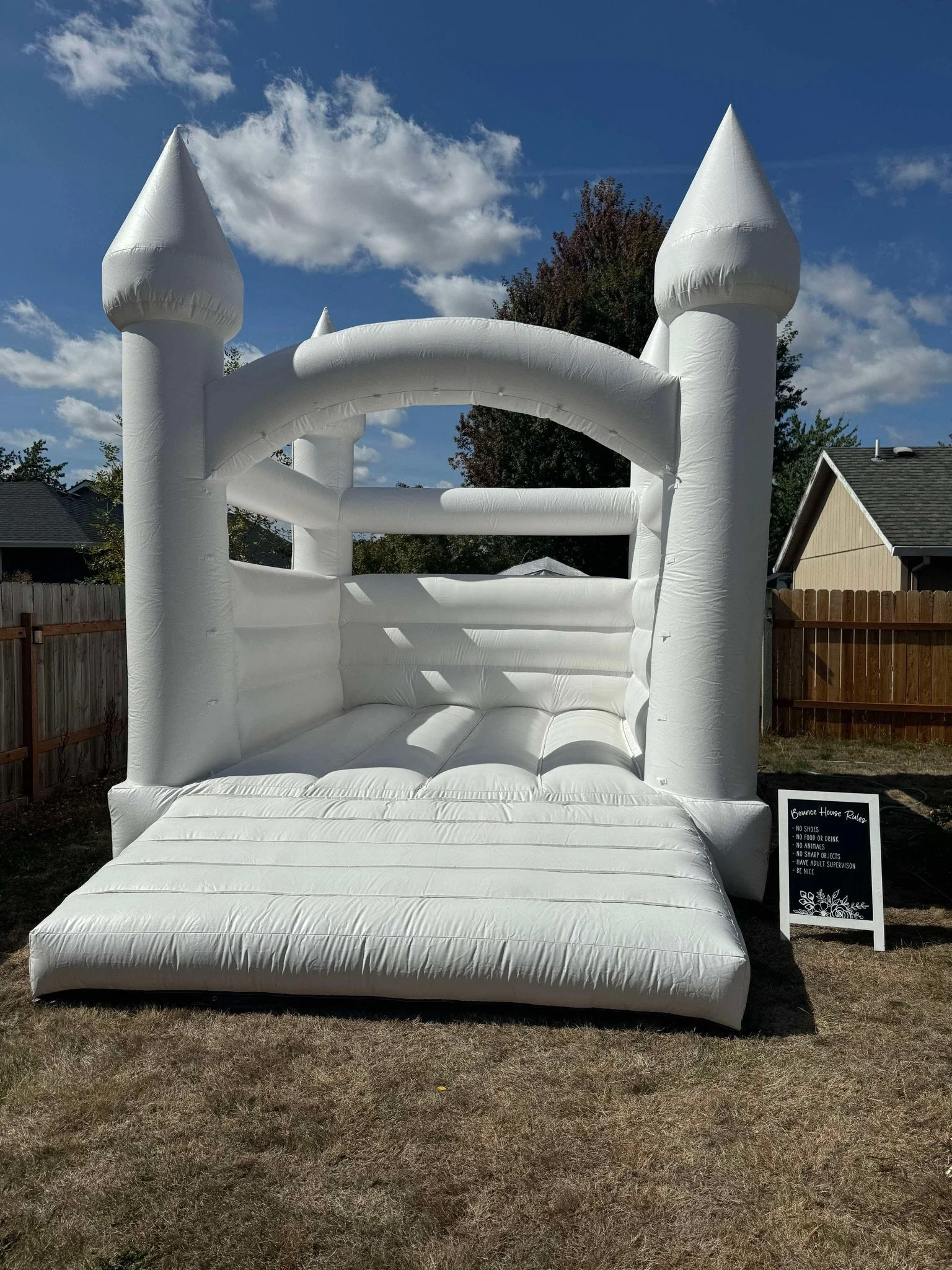 Description: This all white bounce house is ideal for weddings, ceremonies, baptisms, or event black light parties! It is 13 x 13 and a little over 15 ft high. This white castle can attach balloons to your liking with the hooks and create your own theme as well.