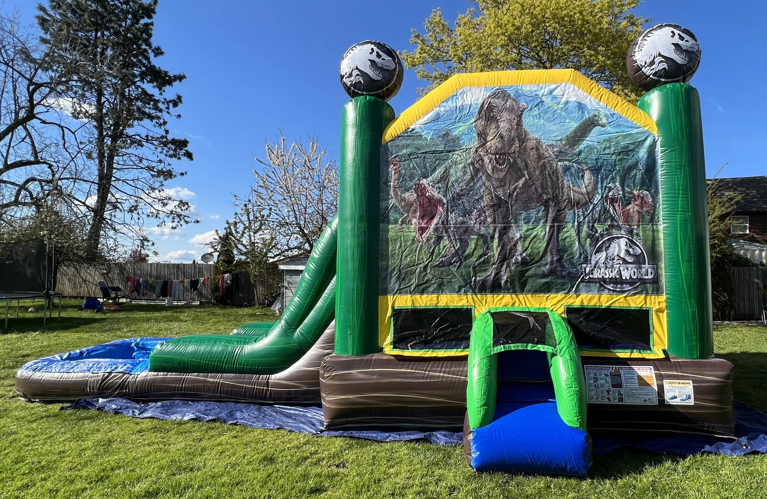 Bring the thrill of dinosaurs to your event with the Jurassic Park Bounce House Combo! Measuring 14 ft x 14.6 ft x 28 ft long, this exhilarating inflatable features prehistoric graphics and interactive elements that transport guests to a world of adventure. Perfect for birthdays, dinosaur-themed events, or any action-packed occasion, this bounce house combo will captivate guests of all ages.